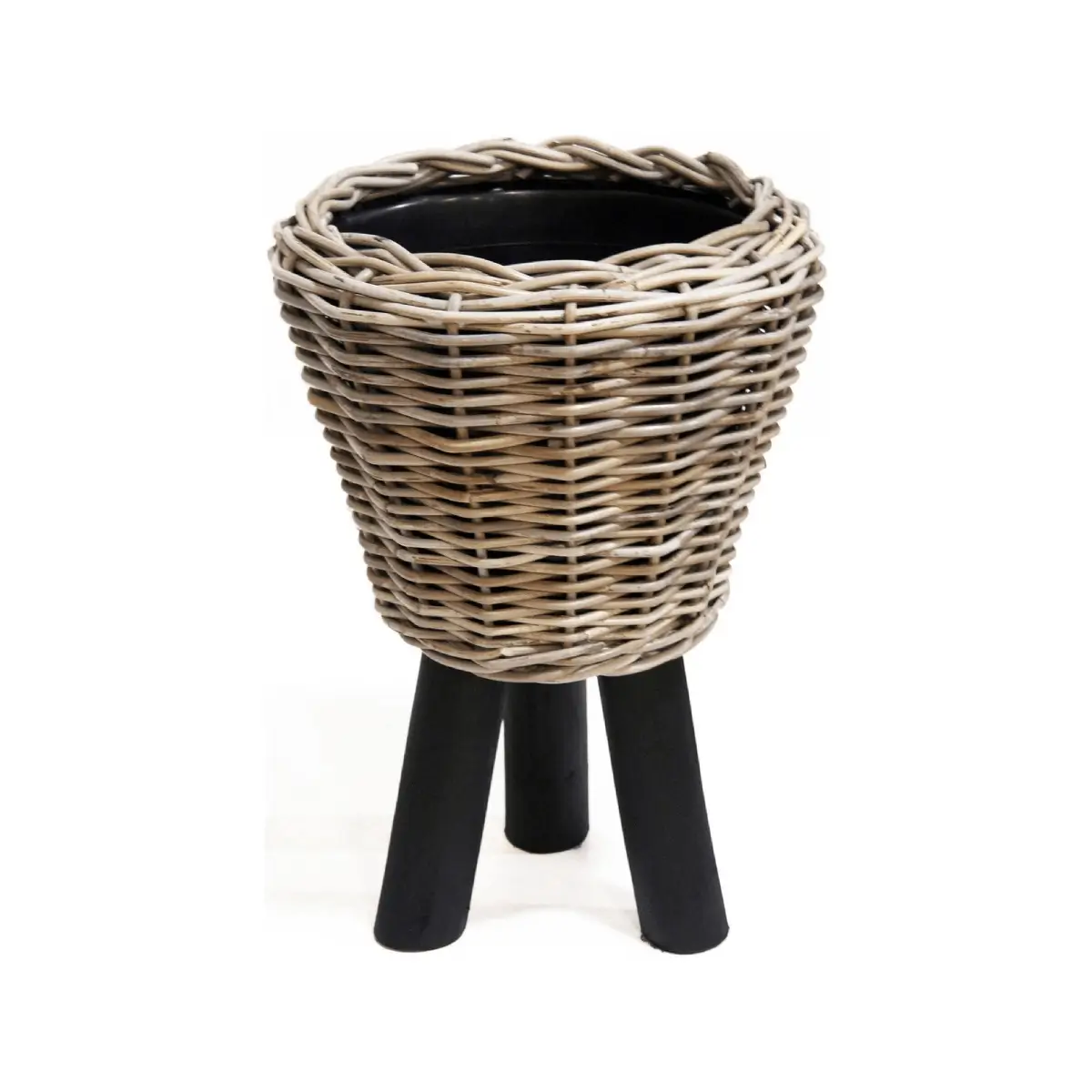 De pot is gemaakt van materialen die op de productpagina worden genoemd als hout, rotan en kunststof. Bovendien staat vermeld dat de pot vorstbestendig is, geen afwateringsgat heeft en geschikt is voor binnen en buiten.