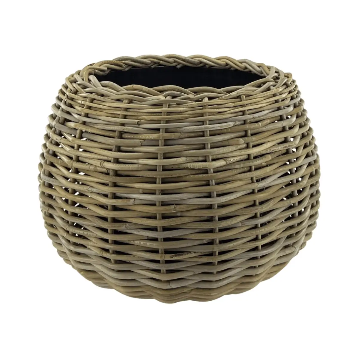 De buitenzijde van deze bolvormige Drypot rotan plantenmand is gemaakt van natuurlijk en duurzaam rotan. Dit materiaal zorgt voor een warme en rustige uitstraling. Tegelijk geeft de grijze kleur een moderne touch. Daardoor past deze plantenmand moeiteloos in verschillende woonstijlen.